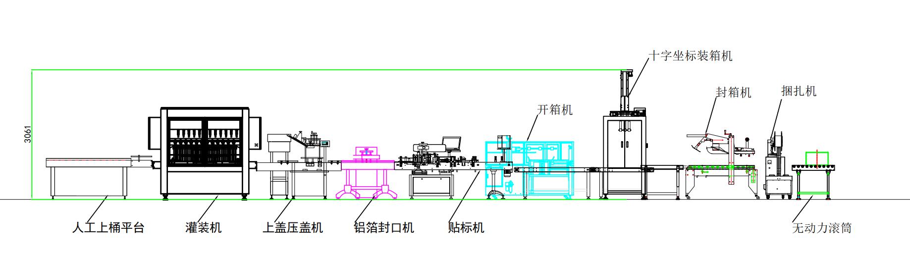 主要是人工上桶-灌裝機(jī)-上蓋壓蓋-鋁箔封口-貼標(biāo)機(jī)-開箱機(jī)-裝箱機(jī)-封箱機(jī)-捆扎機(jī)。價格可以根據(jù)這個方案的設(shè)備決定。還可以根據(jù)工廠配備人工來定不同的流水線。價格在5-25萬左右,具體價格以銷售方案報價為準(zhǔn)。